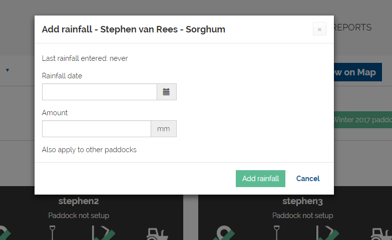 Clicking on that button will give you a popup directly on top of the dashboard - this allows you to quickly enter the rainfall for that paddock. If you're not sure when you last entered rainfall for this paddock, the date that you last entered rainfall is listed at the top!