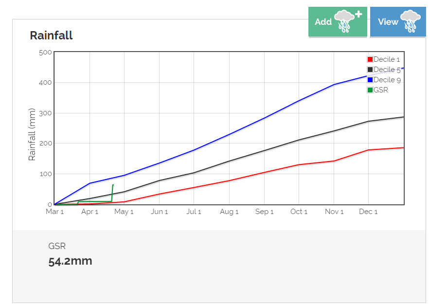 If you want to view the yearly rainfall chart for that paddock, you'll need to click on the eye button to go to the Paddock Overview page. One of the sections on that page is titled "Rainfall", and has a graph showing the GSR over time for your paddock compared with rainfall deciles for your location. On the top right-hand corner of that graph are two buttons - one is to add manual rainfall, which will display the same popup as above, and the other will take you directly to the Manual Rainfall page for that paddock, where you can see your entered rainfall for the whole year.